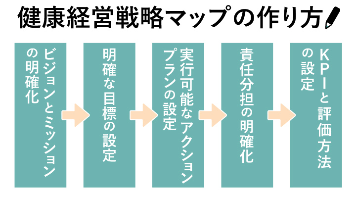 健康経営戦略マップは、いきなり書式を埋めるのではなく、「経営課題の整理→健康関連の最終目標(KGI)の設定→従業員の意識・行動指標→健康投資施策→体制・風土づくり」といった流れで組み立てる必要があります。