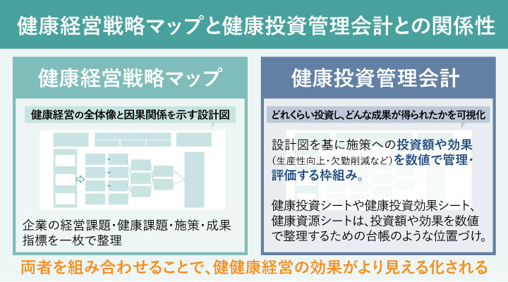 戦略マップは健康投資管理会計の入口であり、両者を組み合わせることで、健康経営の効果がより見える化されるといえます。