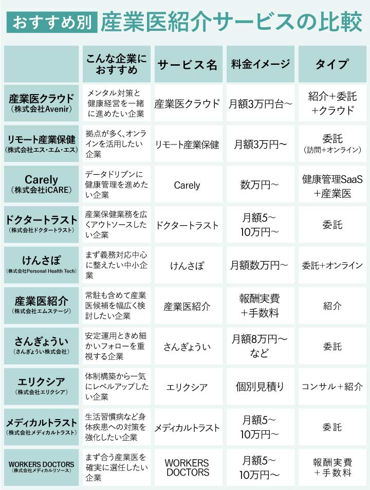 おすすめは、①自社の課題(例:メンタル不調が多い/長時間労働が多い)を整理して伝える、②その課題に合う産業医像を一緒に言語化してくれる会社を選ぶ、というステップです。