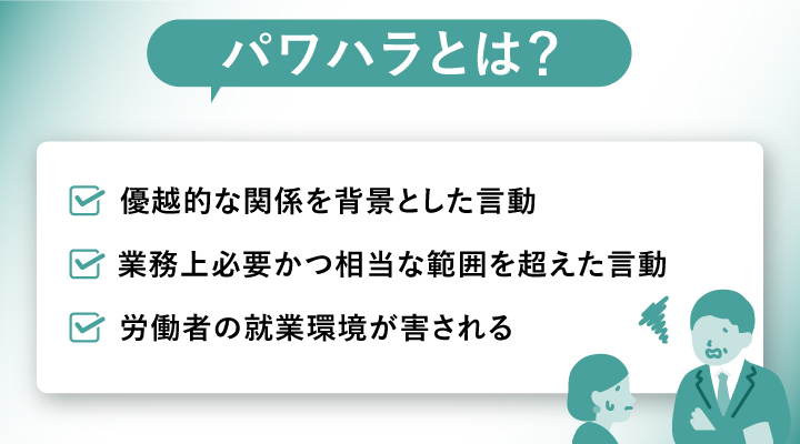 パワハラは「職場の優越的関係」を背景に起きる点が軸になります。