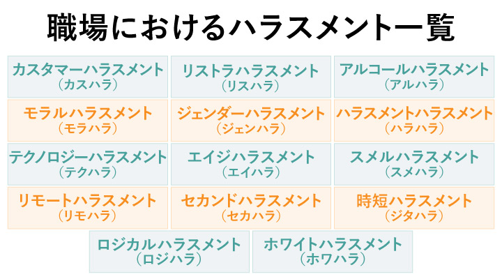 ここでは、職場で起こりやすいハラスメントを10種以上取り上げます。ハラスメントには法律上の定義が明確なものもあれば、社会通念として広まった呼称もあり、名称の有無だけで判断すると見落としが生じます。