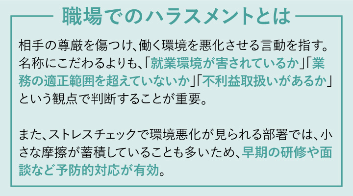 社内では、行為例(やってはいけない具体例)と対応手順(相談→聞き取り→措置→再発防止)を基準化し、相談窓口・産業医面談・ストレスチェックの結果と連動させると、現場が迷わず動ける仕組みになります。